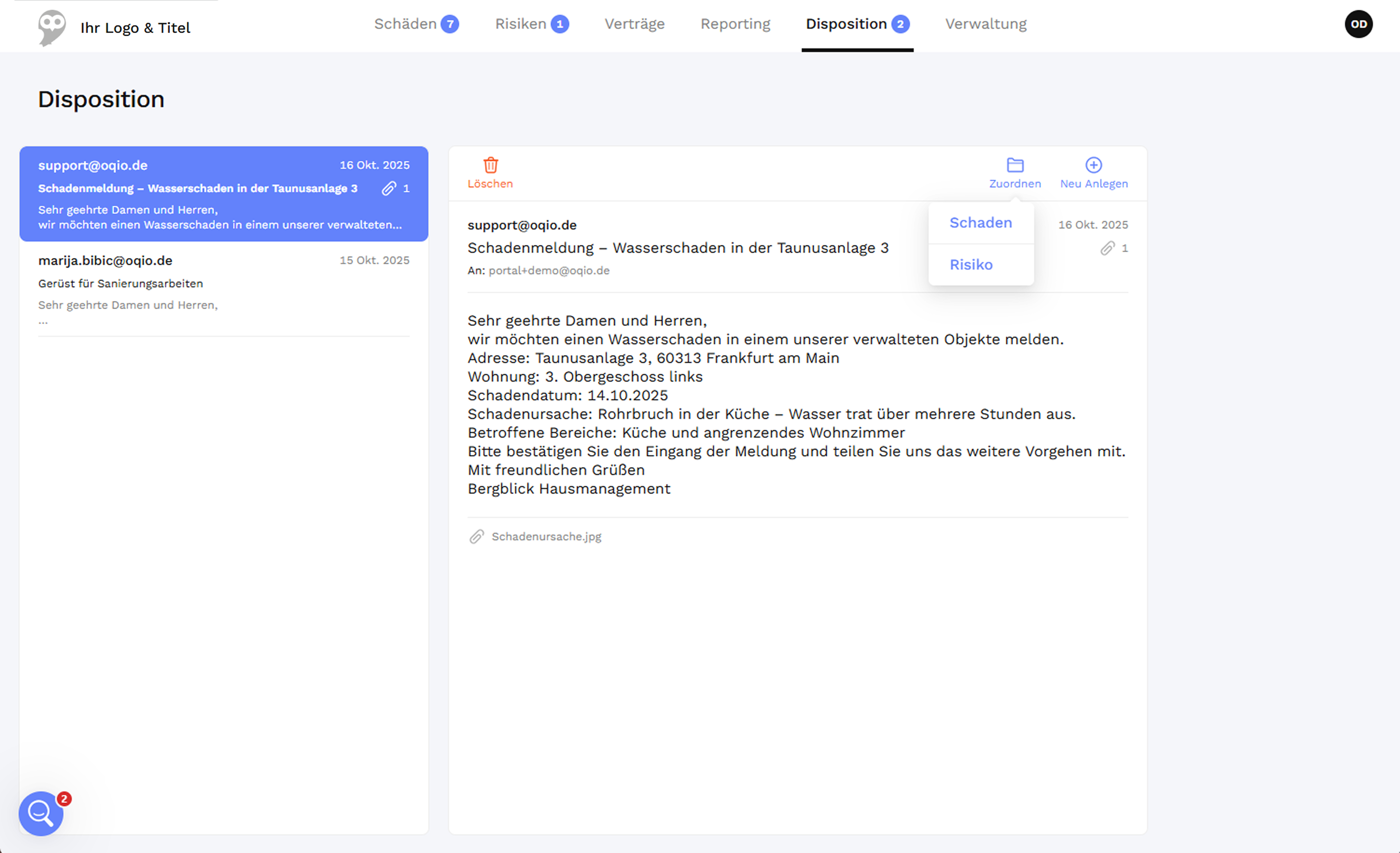 Mit oqio können Sie Ihren Kunden in der Wohnungswirtschaft, die noch nicht auf oqio arbeiten, jetzt eine besonders einfache Lösung anbieten: Schadenmeldungen und Mitteilungen zu Verträgen können direkt per E-Mail an Ihre Portaladresse geschickt werden. Ohne Login, ohne zusätzliche Schritte – ganz so, wie Ihre Kunden es gewohnt sind.